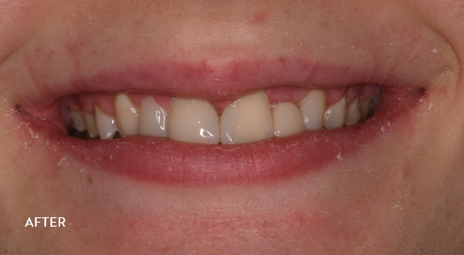 Old crowns causing constant irritation, hygiene challenges and a smile that felt unbalanced resolved by a surgical gum lift procedure and new crowns for a beautiful, confident smile!