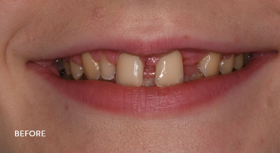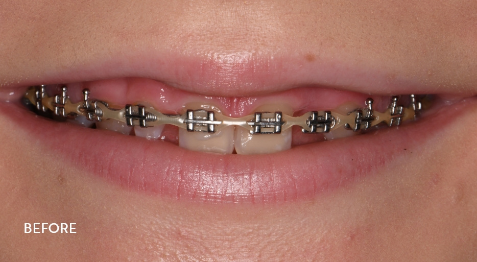 This is an amazing post-ortho glow up for our 15 year old patient. After braces, we completed a gum lift and then cosmetic bonding to fill in the gaps between her teeth, as well as a Maryland bridge to replace her missing tooth. This will give her time to grow and can consider veneers and an implant in the future.