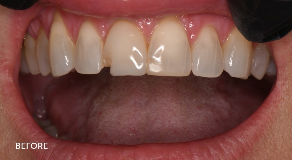 The patient wanted to close the dark gaps (black triangles) in her front teeth. We did a combination of two veneers and composite bonding. The patient loved her new smile and check out the perfect color match!