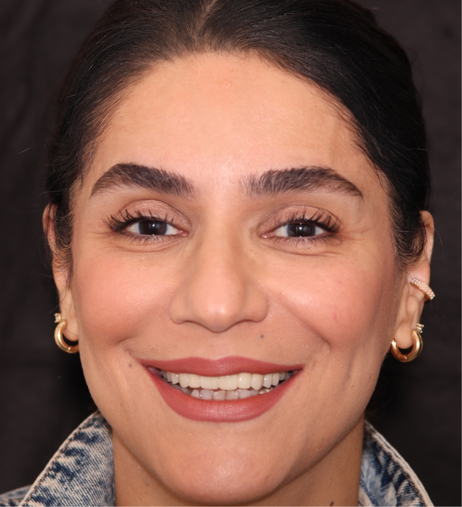 The patient wanted to close the dark gaps (black triangles) in her front teeth. We did a combination of two veneers and composite bonding. The patient loved her new smile and check out the perfect color match!